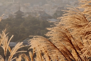 紅葉の時期、11月下旬からの一か月程度、若草山から見る日没&夕日は、角度的に丁度興福寺五重塔の後に沈みます。そのことを思い出し、その景色を見たいがために若草山に登りました。