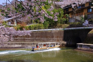 1. 多少人が多くても桜のボリュームと疎水船のコラボを楽しみたいなら、山科安朱橋付近。