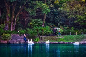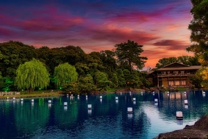 夕暮れから灯りが浮かぶ池と、ライトアップされた庭園が作り出す空間。