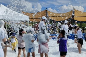 恐竜の顔のスライダーや巨大フワフワ遊具、見ていて笑っちゃうくらい、やりすぎな泡が噴射される水遊びゾーンなどがあって、子供達が大はしゃぎで遊んでいました。
